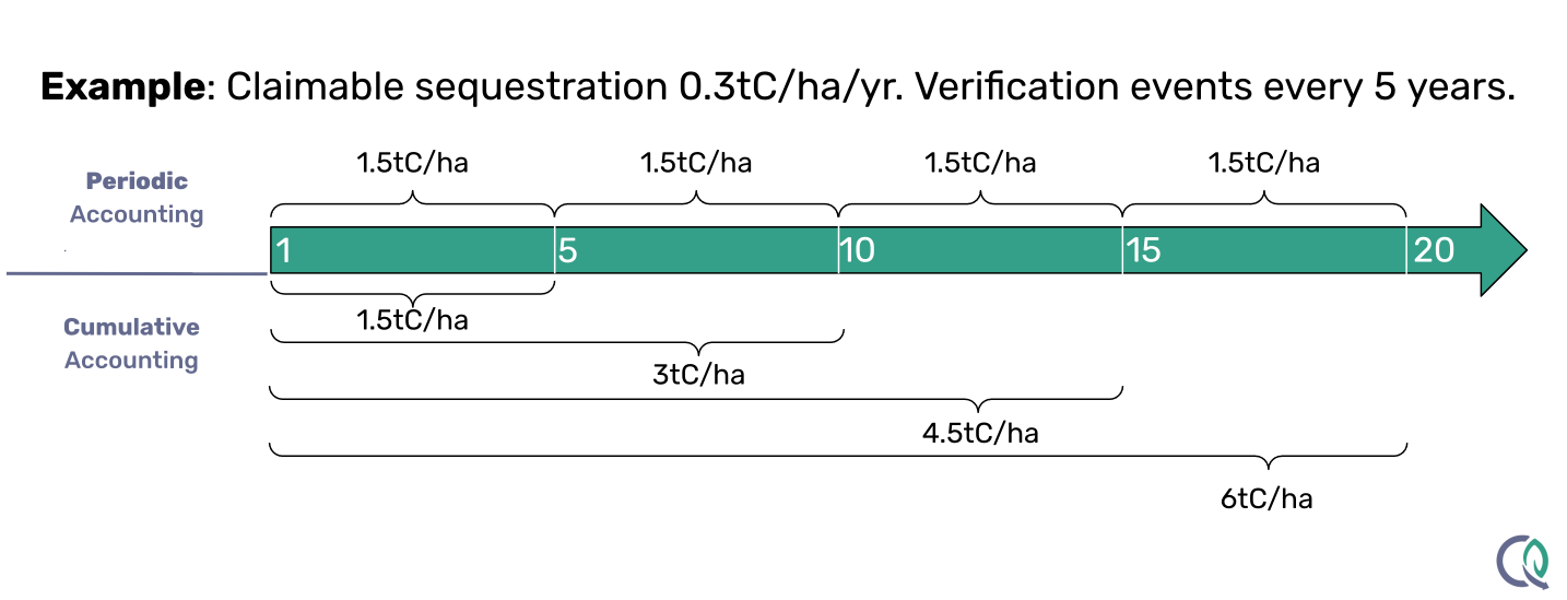 Cumulative accounting allows project developers to consider the total cumulative SOC stock change since the project started when calculating the sample size or uncertainty deductions. Previous versions of VM0042 required project developers only account for SOC stock change from the previous verification event, rather than the entire project duration. Verification events occur when Validation and Verification Bodies (VVBs) audit and approve the outcomes of a project for a given time period.